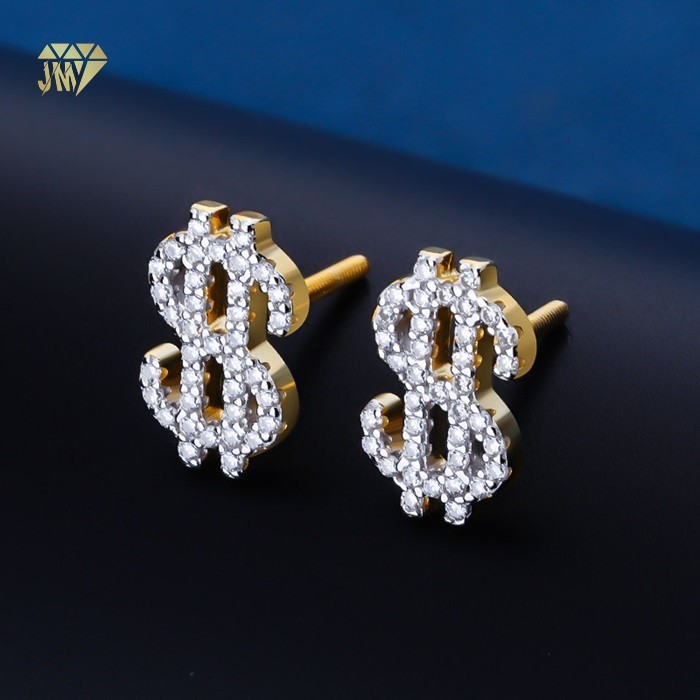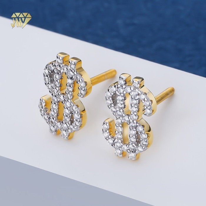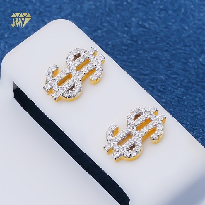 14k yellow gold earrings as 14k gold inlaid with high quality moissanite diamonds that replicate the brilliant fire of natural diamonds. The unique dollar sign design caters to the trends of the European and American markets, suitable for daily wear, trendy styling, and other scenarios.Help clients build differentiated jewelry product lines and seize overseas markets with highly recognizable items.