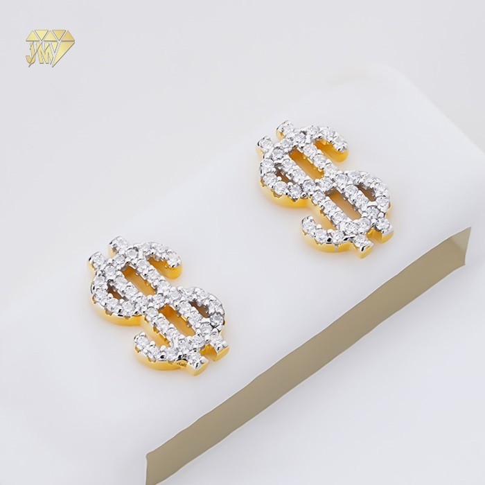 A 14k yellow gold dollar crafted from solid 14K yellow gold with DEF-colored lab-grown moissanites accenting the iconic dollar sign silhouettes. three-fold reinforced gold plating on hypoallergenic titanium posts ensures a long-lasting shine. Symbolic design combines streetwise style with luxury. there is the option of custom engraving. comes in an anti-tarnish gift box and ships worldwide.