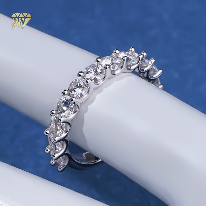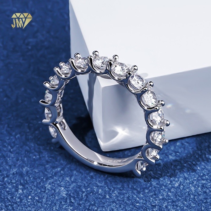 Professional jewelry manufacturer, providing OEM for North American jewelers for half - eternity wedding bands! Made of 925 silver with rhodium plating, round moissanites inlaid in the front. Services include design, customization, production, packaging, and global shipping. Help create unique jewelry products, suitable for wedding scenarios, and enhance the competitiveness of jewelry business.