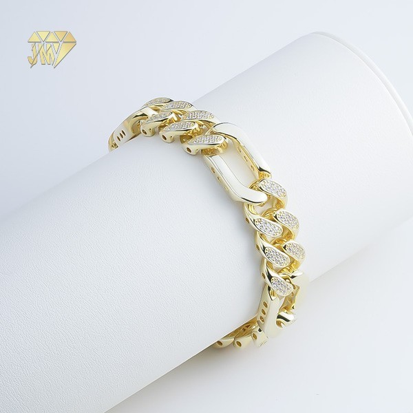 This men’s Cuban link bracelet is crafted from solid 925 sterling silver, plated with luxurious 18K yellow gold for a lasting shine. Each link is embellished with high-quality moissanite stones, offering brilliance comparable to real diamonds. Designed for men who appreciate bold and stylish jewelry, this Cuban bracelet combines durability, luxury, and trend. Perfect for streetwear, hip-hop fashion, or statement daily wear.