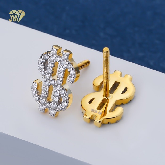 14k yellow gold earrings as 14k gold inlaid with high quality moissanite diamonds that replicate the brilliant fire of natural diamonds. The unique dollar sign design caters to the trends of the European and American markets, suitable for daily wear, trendy styling, and other scenarios.Help clients build differentiated jewelry product lines and seize overseas markets with highly recognizable items.