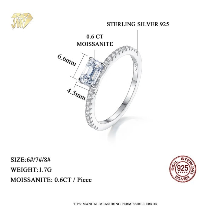 Enhance your jewelry collection with our 925 Sterling Silver Rhodium-Plated Engagement Ring, which is ideal for North American wholesalers and retailers due to its timeless elegance and durability. A 0.6ct Emerald Cut Moissanite set in a traditional four-prong setting serves as the centerpiece, highlighting the stone's geometric clarity and fire. Delicate moissanite accents along the band add to the ring's opulence, while rhodium plating guarantees tarnish resistance and long-lasting brilliance. Being a full-service manufacturer, we provide end-to-end OEM/ODM services, including precision production, premium packaging, worldwide shipping, and bespoke design customization (such as band engravings and carat adjustments). Our lab-created moissanite offers diamond-like sparkle at a competitive price, and it conforms to ethical sourcing trends. Perfect for bridal lines or engagement collections, collaborate with us to produce jewelry that stands out from the competition and appeals to your clientele.