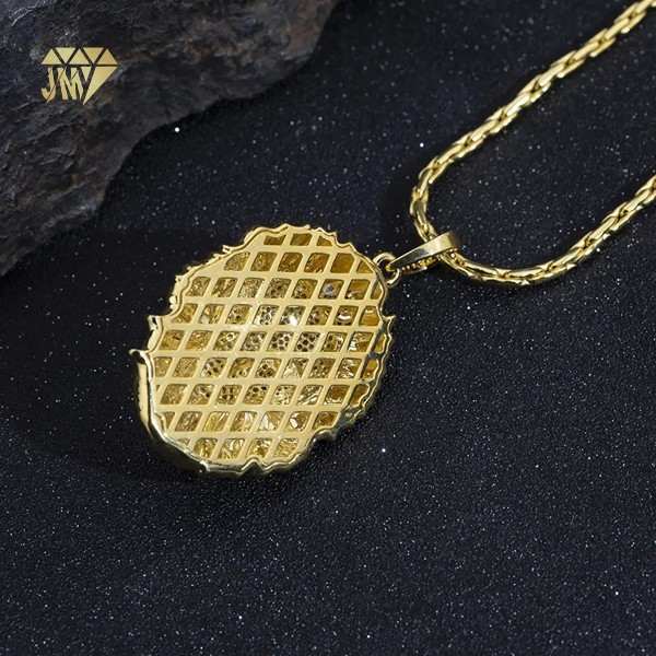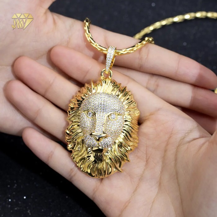 Lion pendant necklace was made of 925 sterling silver and plated with 18K gold, This pendant necklace with a lion's head radiates richness. With its many glittering Moissanite inlays, the three-dimensional lion head pendant captures the majesty of a lion with subtle nuances and distinct mane textures. It has a hip-hop avant-garde style and is matched with a textured silver chain, making it perfect for customers seeking individuality and a sense of strength. It is a superior option for hip-hop jewelry in the North American and European markets due to its fine craftsmanship, long-lasting plating, and compliance with European and North American jewelry export regulations.
